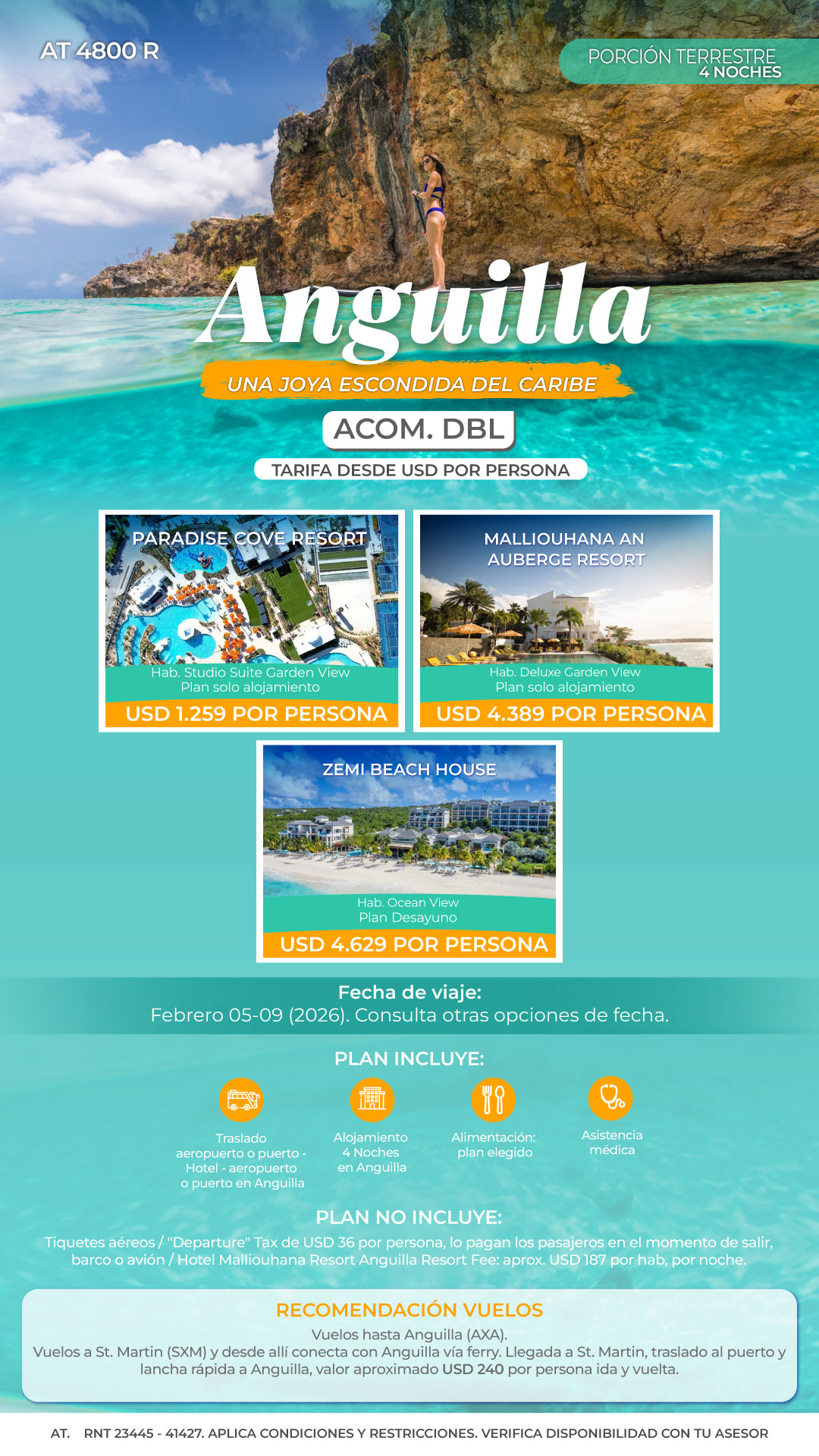 - Vuelos a St. Martin (SXM) y desde allí conecta con Anguilla vía ferry. Llegada a St. Martin, traslado al puerto y lancha rápida a Anguilla, valor aproximado USD 240 por persona ida y vuelta.