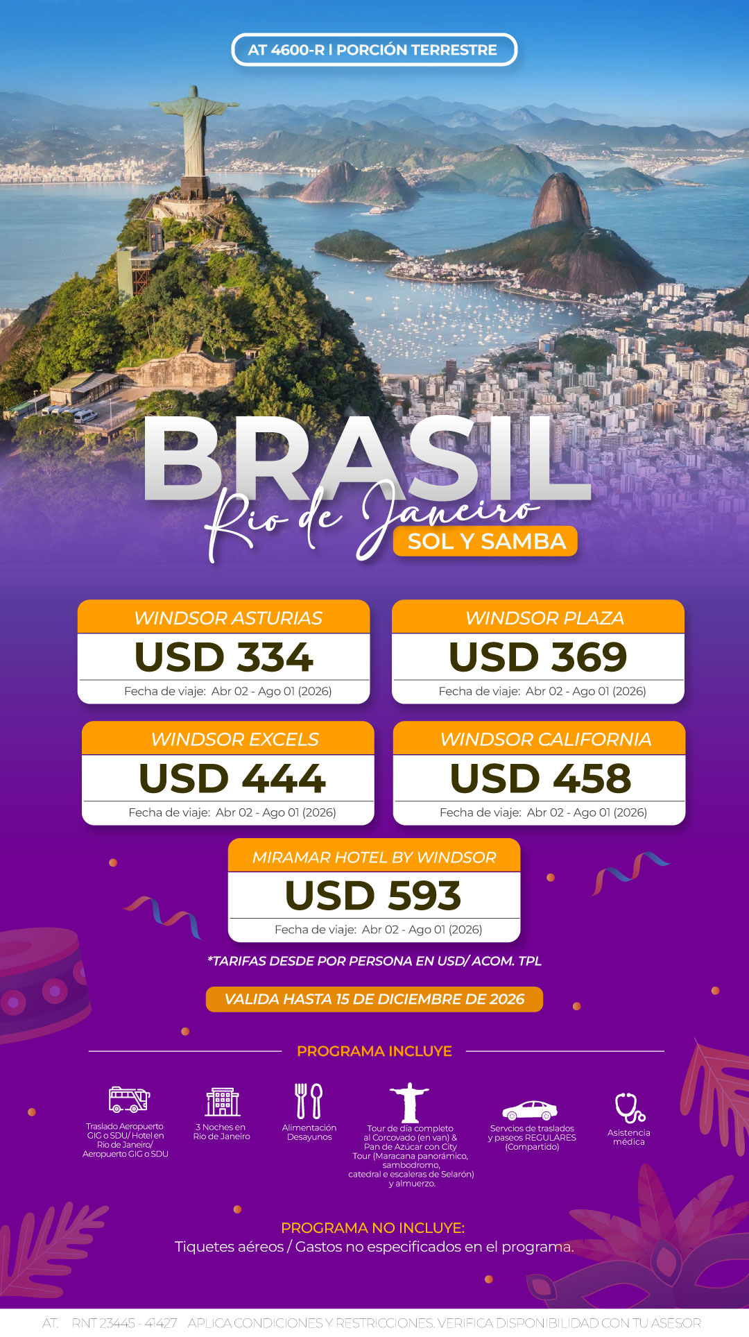 - 3 noches de alojamiento con desayuno en Rio de Janeiro.