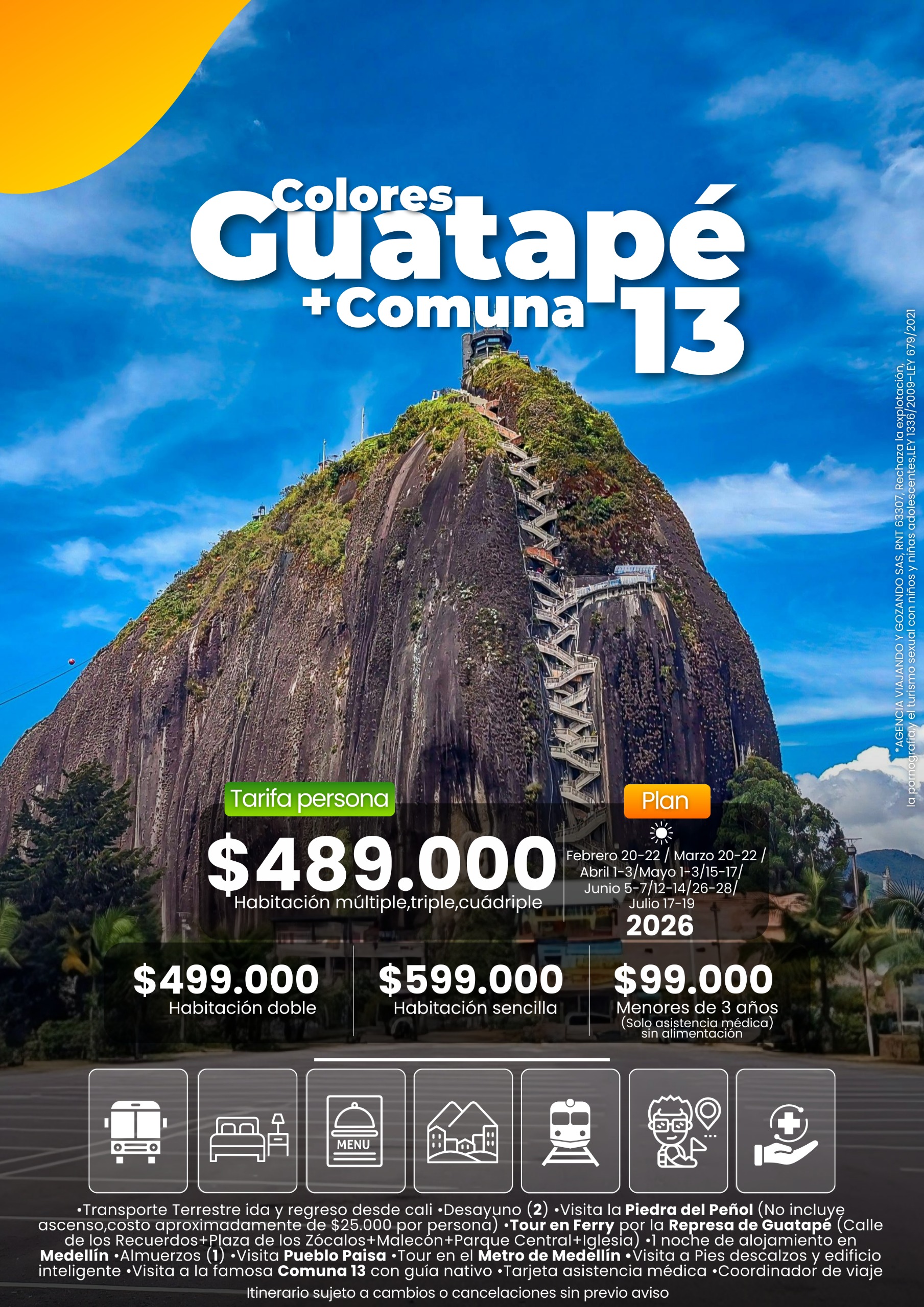 DIA 1: Llegada 8am aproximadamente a la piedra del Peñol, una maravilla de la naturaleza, un monolito de 220 metros de altura, desde donde se puede ver la panorámica del embalse de más de 2.200 hectáreas de extensión, desde allí se observa la antigua ubicación del pueblo, allí tomaremos nuestro primer desayuno incluido para continuar la visita a la Piedra del Peñol, la segunda más grande del mundo, tiene 702 escalones aproximadamente; después el desayuno haremos el ingreso a la piedra (No incluido, tiene un costo de $25.000 por persona); después del recorrido retornamos para salir al tour en ferry por la represa de Guatapé (lo realizaron para crear la interconexión de embalses de Colombia y así, abastecer las necesidades del resto del territorio), tiempo estimado 1 hora, al terminar tenemos el tiempo libre para almorzar (No incluido) y realizar un tour por las calles principales de Guatapé, calles empedradas que se adornan con casas pintadas de múltiples colores. Se destacan construcciones de doble altura en las que sobresalen balcones de madera, visitaremos la plaza de los zócalos, parque central, iglesia, calle de los recuerdos, malecón y réplica del antiguo peñol. Terminado el recorrido nos dirigimos hacia Medellín, visitaremos el famoso pueblito paisa donde haremos un pequeño recorrido, continuamos para el hotel para pasar nuestra noche de alojamiento (incluida).