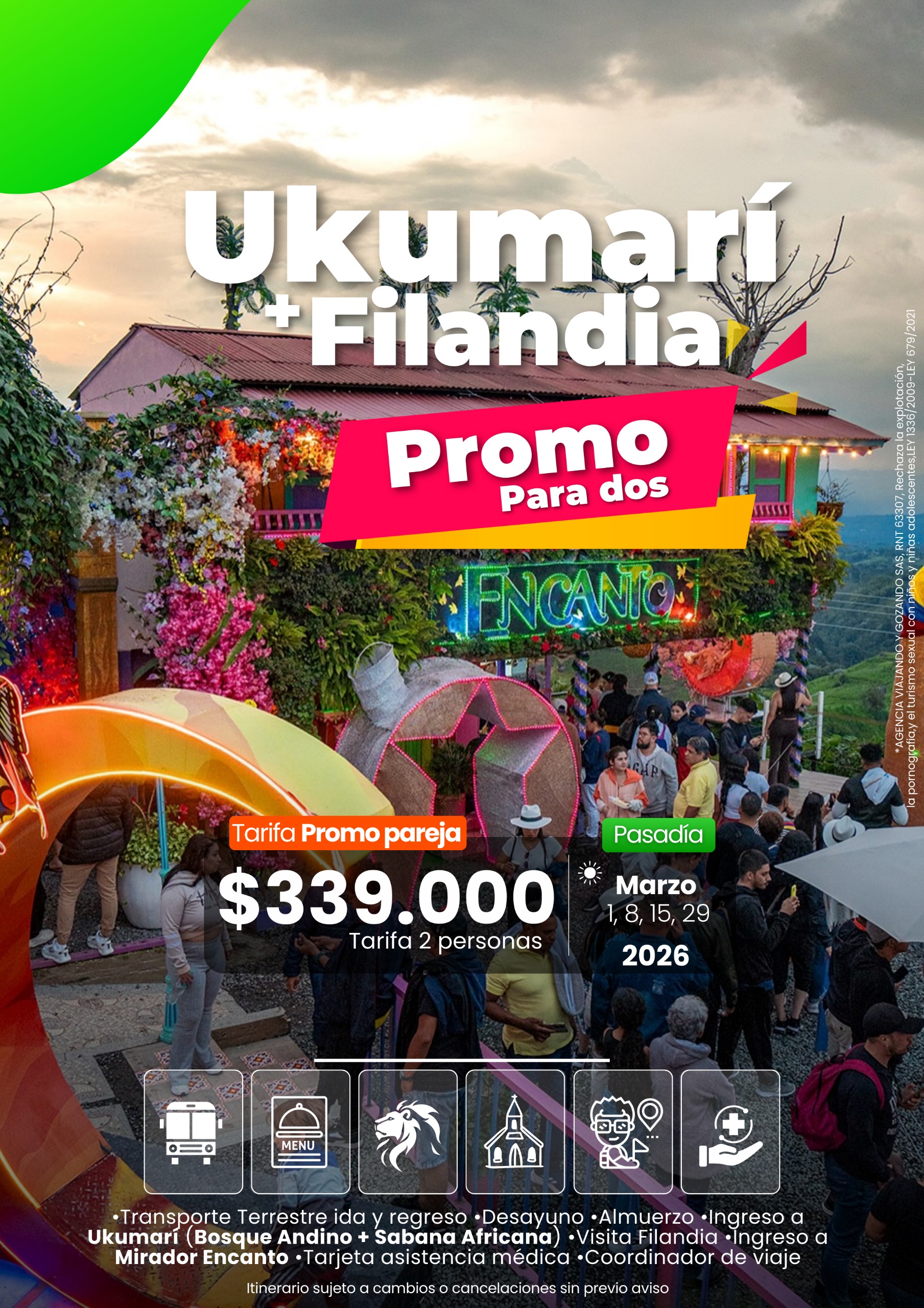 • Cláusula de Responsabilidad: ALIADOS TRAVEL S.A.S con registro RNT 41427, está sujeta al régimen de responsabilidad que establece la ley 300/96 y los decretos 1057/97 y 53/2002. Tarifas sujetas a cambio, disponibilidad y vigencia sin previo aviso. Aplican restricciones y condiciones para cada tarifa publicada según su vigencia. No incluye gastos no especificados en los programas. Los impuestos, tasas y combustibles que afectan las tarifas aéreas, hoteleras y demás servicios ofrecidos por ALIADOS TRAVEL S.A.S. puede sufrir variación en cualquier momento sin previo aviso. Aplican restricciones multas por incumplimiento o cancelaciones de los viajeros conforme a las normas legales. En desarrollo de lo dispuesto en el artículo 17 de la Ley 679 de 2001, la agencia advierte al turista que la explotación y el abuso sexual de menores de edad en el país son sancionados penal y administrativamente conforme a las leyes vigentes.